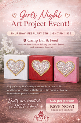 Come create a one-of-a-kind heart home décor piece, laugh with the girls, and enjoy Camp Bar’s unique cocktails or mocktails in the heart of downtown Boerne.